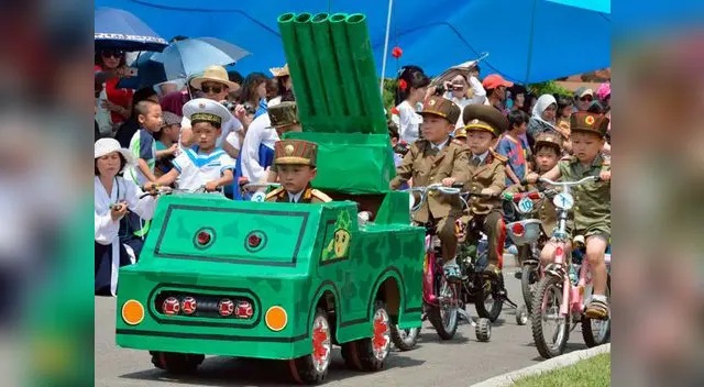 Pionyang. Polémica generó la participación de tres mil niños norcoreanos en el “Día de los Niños”, fiesta local donde habrían sido obligados a desfilar con uniformes militares sobre réplicas de tanques de guerra.