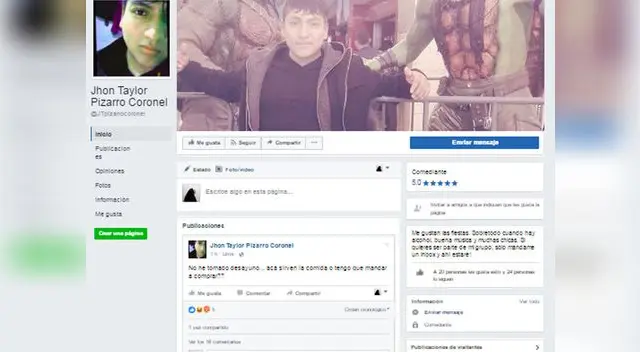 Usuarios de la red social Facebook crearon una página con el nombre del presunto violadorJhon Taylor Pizarro Coronel. La red social tiene la calificación de 'comediante'.