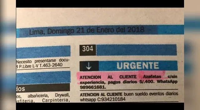 Sin embargo, estos medios de comunicación son usados por bandas de Trata de Personas para captar víctimas y explotarlas sexualmente.El equipo periodístico del programa radial ‘Despierta, denuncia’, iniciativa del Ministerio del Interior (Mininter), llamó a 10 números telefónicos registrados en las ofertas laborales de los diarios más conocidos de Lima, solicitando acceder a empleos.