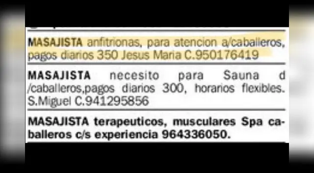 Los anuncios fueron tomados de la sección de clasificados de los diarios de circulación nacional. Los números telefónicos 989 661 681, 950 176 419 y 920 610 638