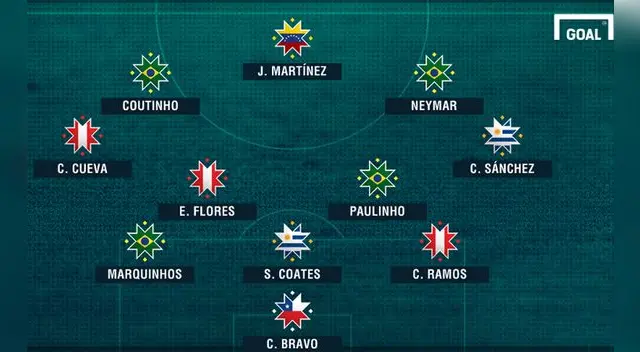 El once ideal lo completan Claudio Bravo (Chile), Sebastián Coates (Uruguay), Marquinhos (Brasil), Carlos Sánchez (Uruguay), Paulinho (Brasil), Neymar (Brasil), Josep Martínez (Venezuela) y Coutinho (Brasil).