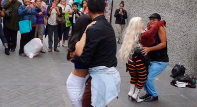Peruano "recursero" baila apretadito la pegagosa bachata Qué Bonitooriginaria de la española Rosario,pero con un muñeca rubia en plena calles del centro de Lima.