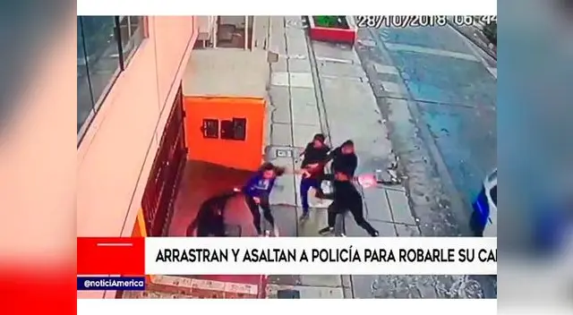 Una cámara de seguridad registró elasaltoque sufrió unamujer policíade transito vestida de civil, al salir de su vivienda con dirección a su centro de trabajo en La Victoria. La robaron su arma de reglamento y su uniforme.