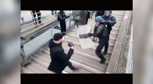 El vídeo de Christophe Dettinger, campeón de Francia de Boxeo en 2007 y 2008, fue difundido en la televisión y las redes sociales desde que fue grabado el sábado por la tarde en la pasarela Léopold Sédar Senghor, que atraviesa el río Sena, cuando la manifestación de los "chalecos amarillos" degeneró en enfrentamientos con las fuerzas del orden.