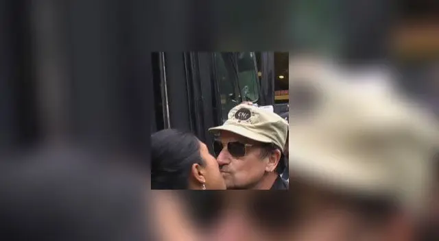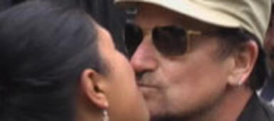 El vocalista de U2 se mostró muy cordial con todas las personas que lo atendieron a su paso por Machu Picchu, pero cuando estuvo a punto de subir al bus que lo llevaría a su hotel no dudó en darle un beso a la guapa trabajadora de la empresa de transporte Conssetur, quien inmediatamente accedió a tal cortesía.