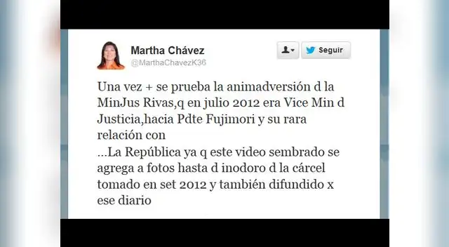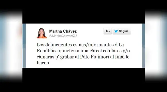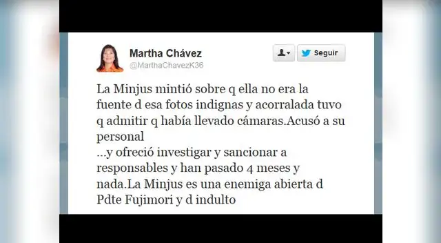 Luego que el diario La República emitiera un video en el que se ve a Alberto Fujimori conversando y riendo en los exteriores de su celda en el Penal Barbadillo, la congresista fujimorista Martha Chávez argumentó que los responsables han incurrido en un delito."Los informantes, entre comillas, de La República y el personal que ha ido premunido de esta cámara, queriendo tergiversar la realidad, ha cometido delito. Y la ministra (Eda Rivas, de Justicia) haría bien en de una vez por todas establecer las responsabilidades", expresó la legisladora.Para Chávez, con dicha grabación se ha incurrido en un delito pues no está permitido ingresar cámaras sin el permiso del INPE y exigió a la ministra de Justicia establecer responsablidades, recalcando que al permitirlo, muestra animadversión hacia Fujimori."Ella era viceministra el día que se ha tomado ese video clandestinamente. Sabe que existen normas que prohíben y sancionan con pena de cárcel introducir celulares y cámaras a los penales. Ella está demostrando odio. Siendo viceministra, ha permitido que personal del INPE infiltrado vaya a grabar a Fujimori", comentó.Como se recuerda, el diario La República difundió un video grabado el martes 3 de julio del 2012, en el que se aprecia a Fujimori conversando y dar órdenes a funcionarios del penal sobre una plaga de mosca blanca que afectó sus cultivos.