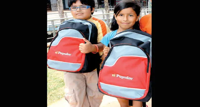 Cada mochila que regalamos con la promoción Al Colegio con el Popular contiene un estuche de colores, crayones, plumones, plastilinas y temperas, además tres lapiceros, tijeras, cuadernos, entre otros útiles necesarios para un buen año escolar.
