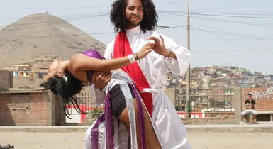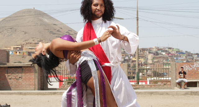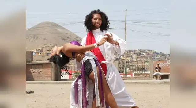 “Uno, dos, tres...”, marca este “Cristo Moreno”, vestido como el Mesías, mientras dobla por la cintura a July Ayala (17), quien encarna a María Magdalena.