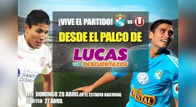 El ganador podrá invitar a siete de sus amigos a ver el partido desde el palco de Lucas y Los Descuentazos, en tribuna Occidente del Estadio Nacional. Lucas y Los Descuentazos te llevará este domingo 28 de abril, a vibrar con el esperado partido entre Sporting Cristal y Universitario de Deportes, por la fecha 12 del Torneo Descentralizado.Para participar y ganar, solo debes ingresar a la página web y darle click al botón “Comprar” en la campaña del palco, que tiene un valor S/.0 (gratis).Si aún no eres seguidor de Lucas y los Descuentazos en Facebook, ingresa a https://www.facebook.com/Lucaspuntope y haz click en “Me gusta”.¿CÓMO TENER MÁS OPCIONES?Para tener más opciones de ver el partido desde el palco de Lucas, comparte la cabecera de Facebook con la promoción entre tus amigos, e invítalos a registrarse y participar.DATOSÚnico. Solo habrá un ganador que podrá invitar hasta 7 amigos.Cuándo. El sorteo será llevado a cabo el día sábado 27 de Abril a las 4pm.Ganador. Se informará vía Redes Sociales (síguenos en Twitter y Facebook) y se avisará por teléfono al afortunado.