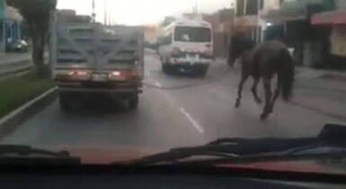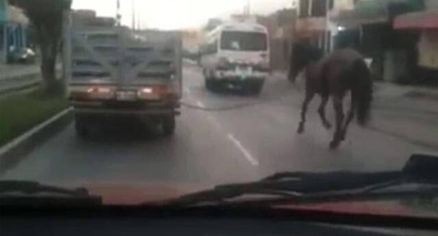 ¿Cuál es el animal? Hernán Villalta Porlles denuncia que este chofer decidió trasladar a este caballo atándolo a su camioneta de placa PF-5209. No toma en cuenta el peligro al que lo expone, en medio del tráfico de la Carretera Central, rumbo a Chaclacayo.