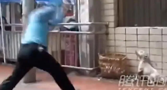 En las imágenes, el oficial persigue al perro hasta que en un momento logra romper un palo sobre la cabeza del can.