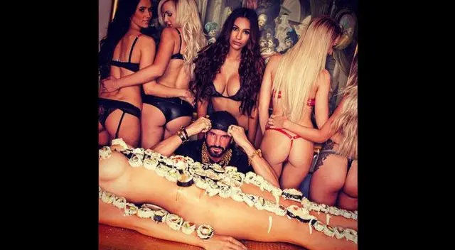 En otras imágenes se observa a una mujer utilizada como una tabla de mesa. Encima de su cuerpo se colocó suchi y makis, los que el sujeto comía sin ningún remordimiento.