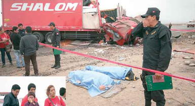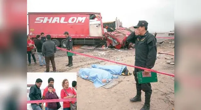 Dos padres de familia que iban al volante de un camión y un tráiler, respectivamente, encontraron horrible muerte al chocar frontalmente cerca del kilómetro 578 de la Vía de Evitamiento, en Trujillo.El conductor del camión de la empresa de encomiendas Shalom C9C 740, Juan Javier Irribarren Vargas, (42) y el chofer que transportaba ladrillos rojos, dejaron de existir en el acto debido al fuerte impacto.Según la policía de Investigación de Accidentes de Tránsito, el tráiler T4C 979 invadió el carril contrario.Ambos no tuvieron tiempo de frenar debido a la velocidad con que iban.El copiloto del camión, Misael Marcos Alberto Espíritu (42), quien viajaba profundamente dormido, se salvó, pero su situación es delicada. Fue internado en el Hospital Regional Docente de Trujillo.Los cadáveres de los choferes fueron sacados de los fierros retorcidos por los bomberos.El conductor del tráiler no ha sido identificado porque no portaba documentos de identidad. Solo llevaba algunos llaveros de juguete, posiblemente, de sus hijos.Los dos enormes vehículos quedaron inservibles.María Berna Segura, tía de Irribarren Vargas, contó que su sobrino es natural de Trujillo, pero reside desde hace varios años en Lima. Deja dos hijas, quienes lo esperaban en su casa para celebrar el Día del Padre.