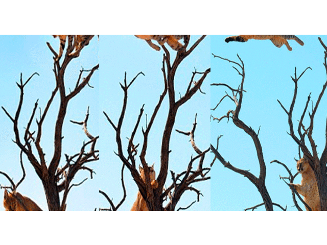 ¿Te imaginas a un gato saltar de una gran altura y no morir en el intento?Sí, este es caso de un intrépido minino que tuvo que escapar de un felino salvaje en África. Las fotografías revelan el acto y ha dejado sorprendido a los usuarios en la web.
