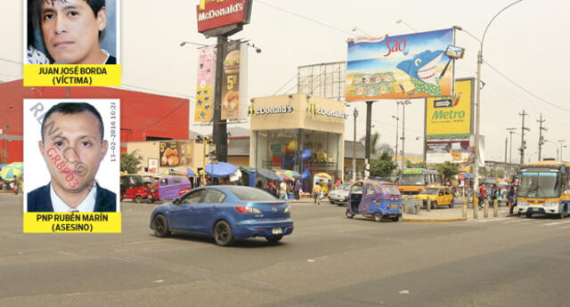 Cuando hacía la cola esperando su turno para ser atendido, en el cruce de las avenidas Los Jardines Este y Próceres de la Independencia, apareció el SO2 PNP Rubén Oscar Marín Alberto (34) junto con su amigo, Jimmy Segundo Rabanal Aguilar (35).