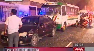 Cuatro personas resultaron heridas esta madrugada luego que una combi impactara una cúster y un auto a la altura de la cuadra 38 de la avenida Tomás Marsano, en Surco.MIRE ESTO: Ate Vitarte: Furgoneta se pasa la luz roja y mata a niñaJesús Mayorín, conductor de la unidad particular, comentó que el vehículo menor fue el responsable del triple choque ya que venía a excesiva velocidad.Precisó que el chofer de la combi, que cubría la ruta Villa El Savador- San Juan de Miraflores, hizo caso omiso a los conos de seguridad que indicaban que la cúster estaba averiada.El fuerte impacto provocó que tanto el conductor y copiloto del vehículo que ocasionó el accidente, quedaran atrapadas entre los fierros retorcidos.Otros dos pasajeros de la combi también resultaron heridos. Todos ellos fueron llevados al hospital Casimiro Ulloa, ubicado en Miraflores.Trascendió que el vehículo de transporte público menor seis mil soles en papeletas.