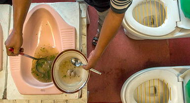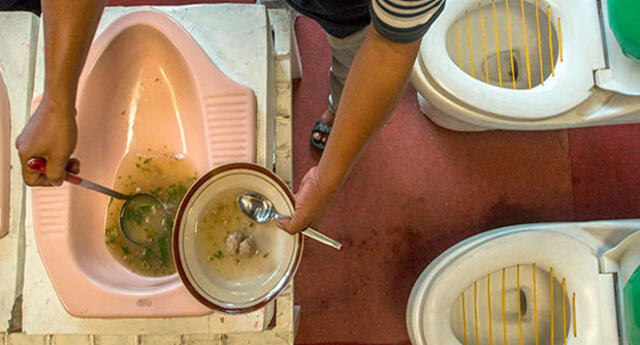 "Al principio sentí asco, pero al final comí una parte de la comida por curiosidad", explica Mukodas, un hombre de 27 años ante una sopa servida en una taza de inodoro.