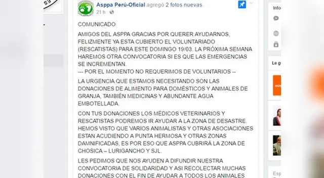 La Asociación Peruana de Protección a los Animales (ASPPA – PERÚ) ha tomado la iniciativa, a través de su página Facebook, de recolectar todo tipo de apoyo para brindárselo a las mascotas que se han visto perjudicados por el paso de los huaicos.