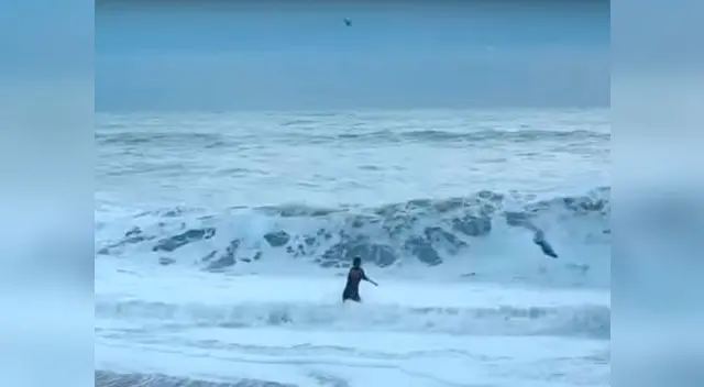 La mujer insiste en entrar al mar pero vuelve a perder el equilibrio a causa de la corriente. El perro alcanzó la costa por su propia cuenta, aprovechando el impulso de otra ola. Finalmente, ambos logran salir del agua con ayuda de otra persona.