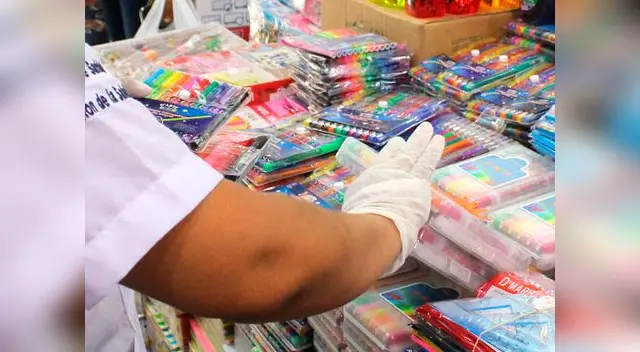 Témperas, gomas, colores, plumones, stickers, cuadernos, entre otros útiles escolares fueron decomisados en operativo por no contar con registro sanitario en Mesa Redonda.