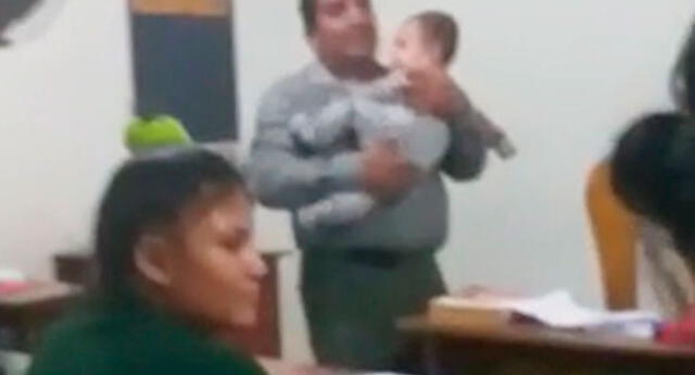 En las imágenes se aprecia al docente cargando a Adrián de 5 meses de edad, que en todo momento se mostró tranquilo, mientras explica a sus alumnos la práctica calificada.