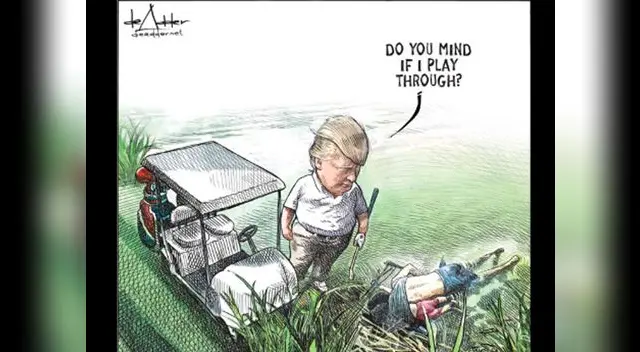En su dibujo editorial, De Adder, quien durante 17 años tuvo un contrato con la firma Brunswick News de Canadá, presentó a Trump de pie jugando al golf junto a la orilla de un lago del campo mirando hacia los cuerpos de los ahogados y con un palo de golf en la mano.