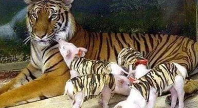 Ocurrrió en un zoológico de Sriracha en Tailandia en el año 2004. El amor que la tigresa prodigó a sus hijos adoptivos asombró a los trabajadores del lugar y a todos los visitantes, quienes acudían solo para contemplar las distintas muestras de cuidado y como los amamantaba.