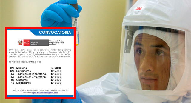 Ante la expansión del coronavirus en Perú, la Dirección de Redes Integradas de Salud Lima Este del Ministerio de Salud (Minsa), lanzó en su página de Facebook una convocatoria de trabajo para personal de la salud.