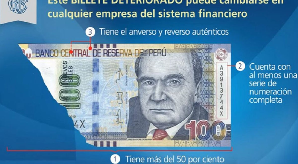 En ocasiones llegan a nuestras manos billetes deteriorados, rotos o quemados y no sabemos qué hacer con ellos, cómo saber si son válidos y dónde cambiarlos por otro en buen estado. El Banco de Reserva del Perú (BCRP) explica cuáles son las características que debe tener un billete para poder ser canjeado y cuáles son los pasos a seguir.