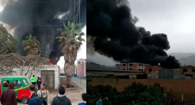 Un fuerte incendio se registró alrededor de las 4: 00 p.m. en una fábrica de colchones y pegamento para sillas en la avenida Las Palmeras en San Juan de Lurigancho.