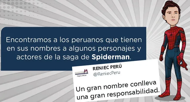 “Un gran nombre conlleva una gran responsabilidad. Encontramos a los peruanos que se llaman como algunos personajes y actores de la saga de Spider-Man”, se lee en el post que está acompañado del hashtag ‘El Perú está en sus nombres’.