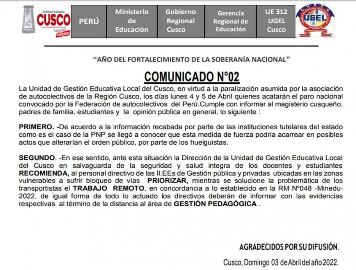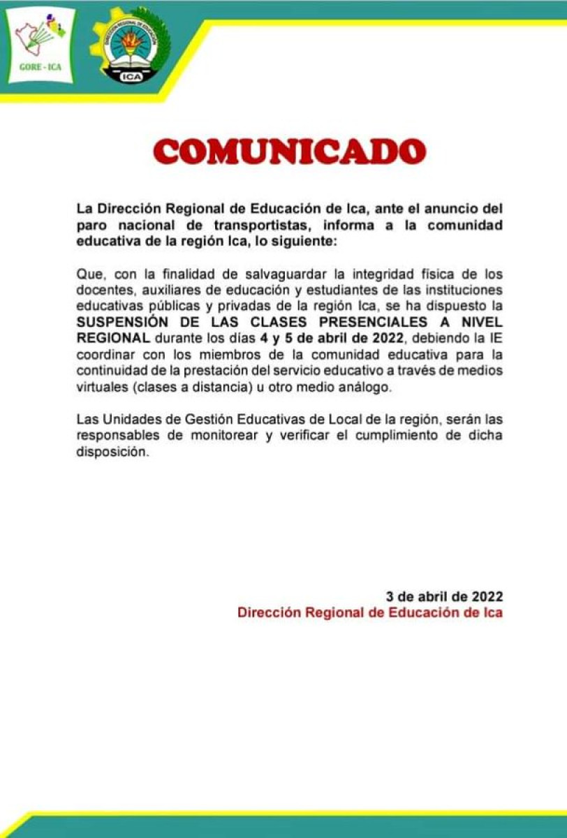 Tras el paro de transportistas convocado a nivel nacional, no habrá clases presenciales este lunes 4 y martes 5 de abril.