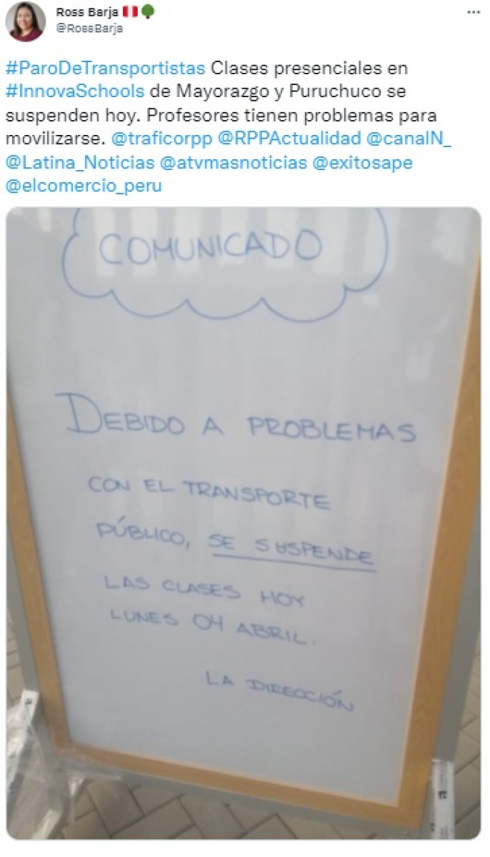 Colegio Innova Schools de Mayorazgo y Puruchuco decidieron suspender las clases presenciales tras el paro de transportes. Asimismo, según indicaron en redes sociales, los profesores tienen problemas para movilizarse hacia el centro educativo.