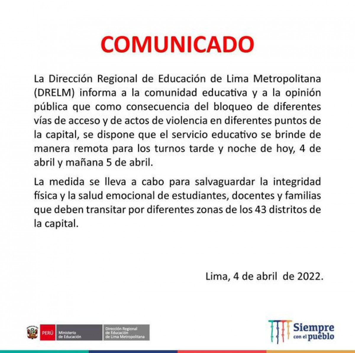 La Dirección Regional de Educación de Lima Metropolitana (Drelm) suspender las clases presenciales hoy, lunes 4 y martes 5 de abril para los alumnos de los turnos tarde y noche hoy y que lleven el aprendizaje de manera remota.