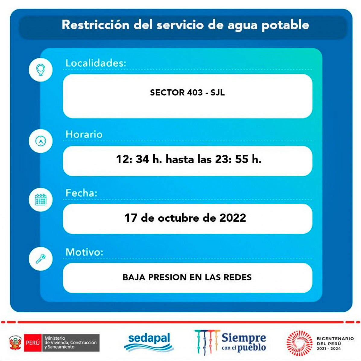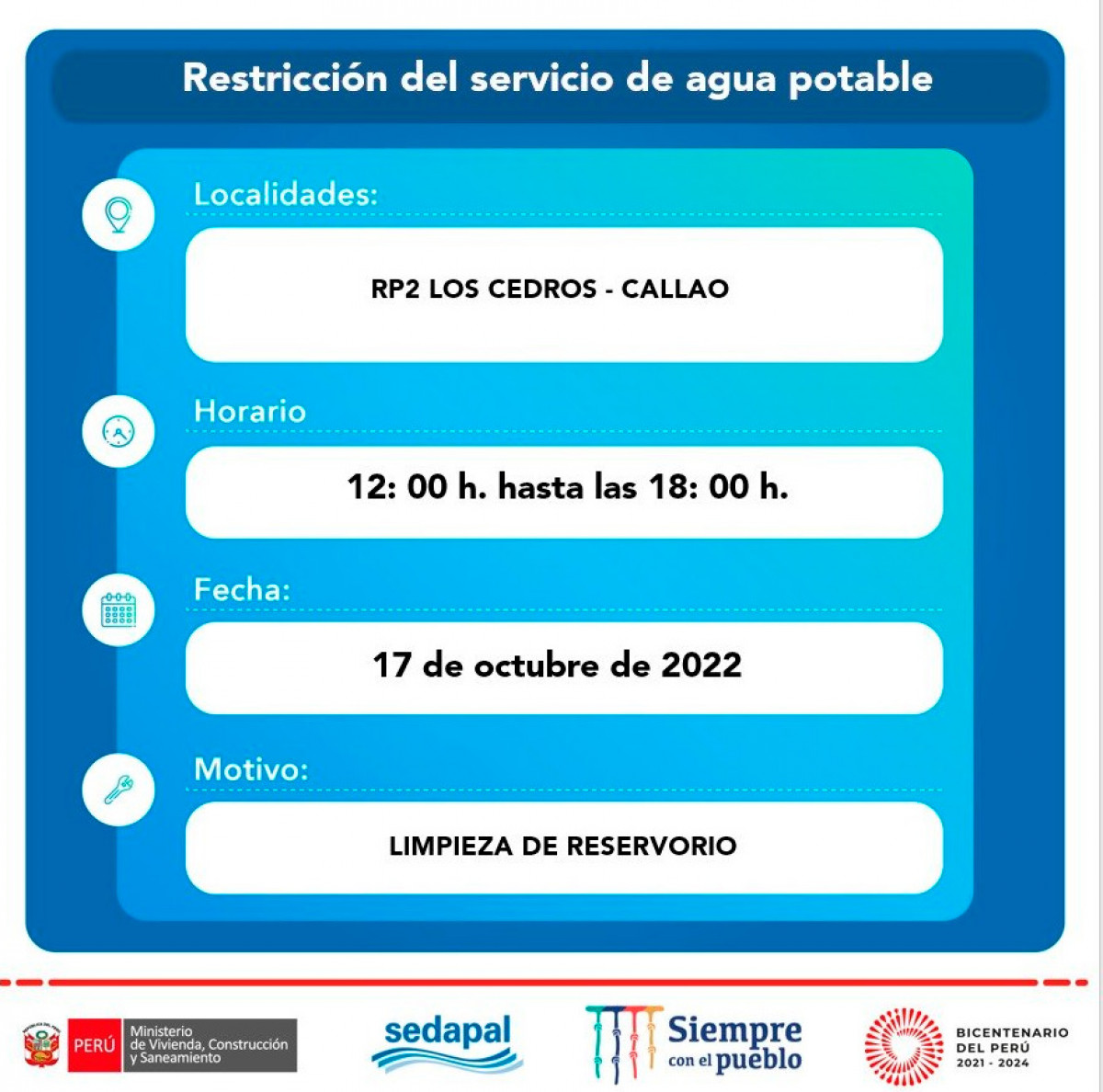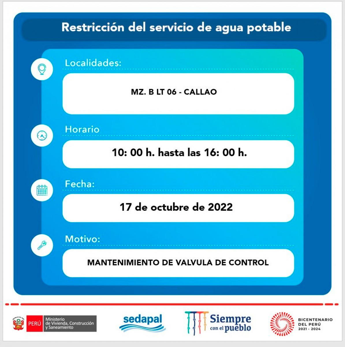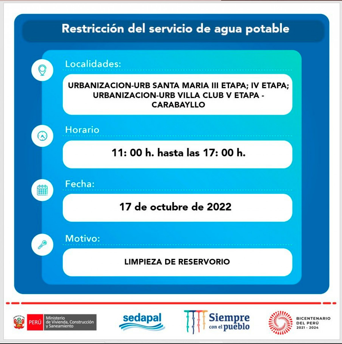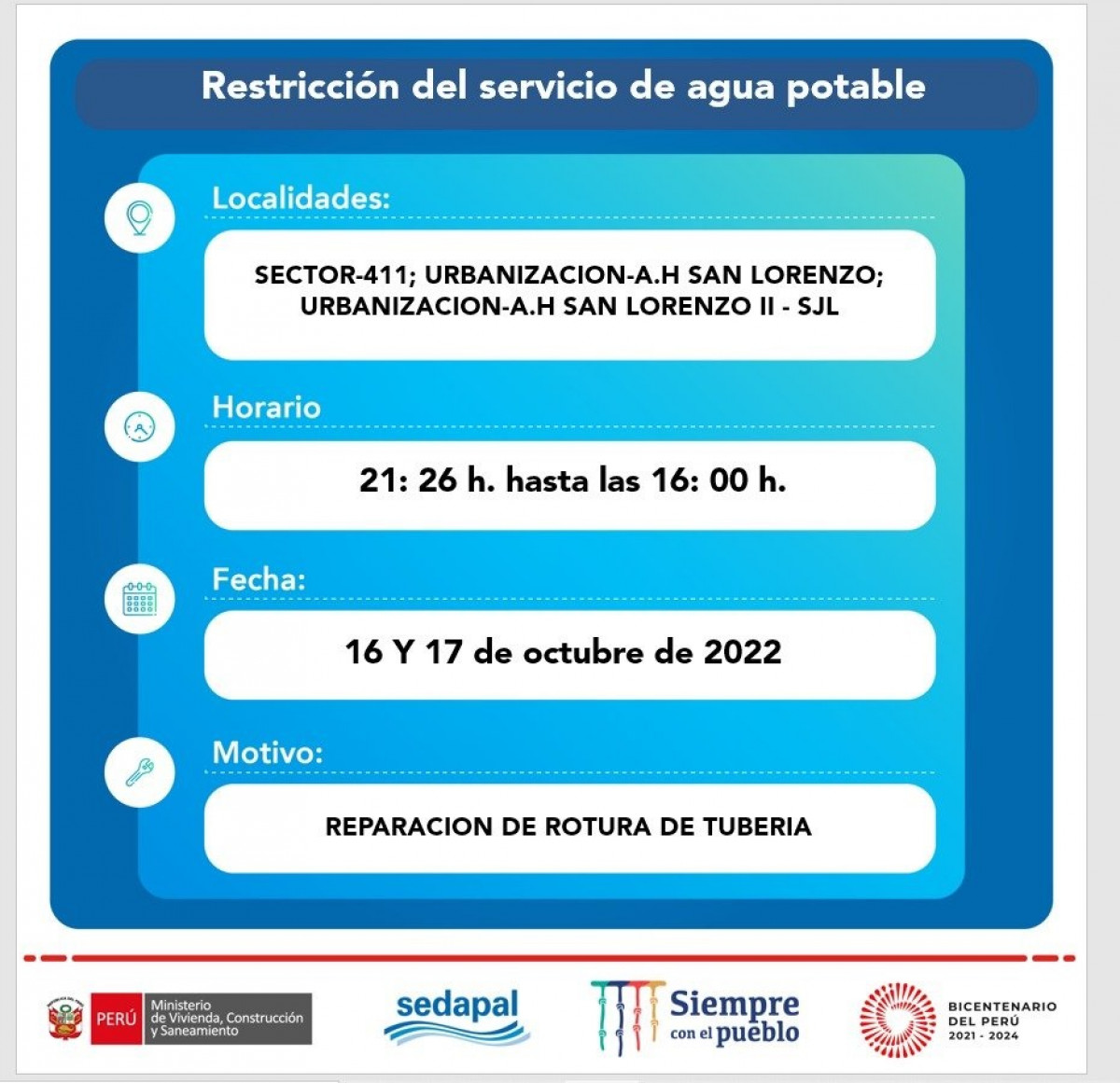 La suspensión del servicio ha sido programada para realizar trabajos de mejoramiento en el sistema de agua potable, por lo que se restringirán zonas específicas por unas horas y las obras no afectarán en su totalidad a las jurisdicciones.