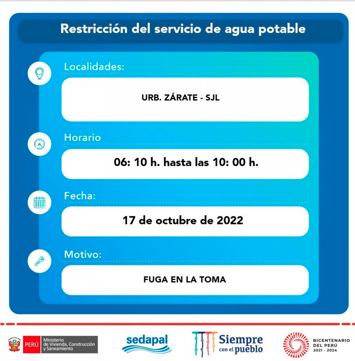 El Servicio de Agua Potable y Alcantarillado de Lima (Sedapal) anunció que el servició de agua potable será suspendido para hoy lunes 17 de octubre en los distritos limeños de La Molina, Ate, Los Olivos, San Juan del Lurigancho y Pueblo Libre. Esto como parte de los trabajos de mejoramientos del servicio, por lo que en esta nota de El Popular te contamos los horarios y las principales zonas afectadas.