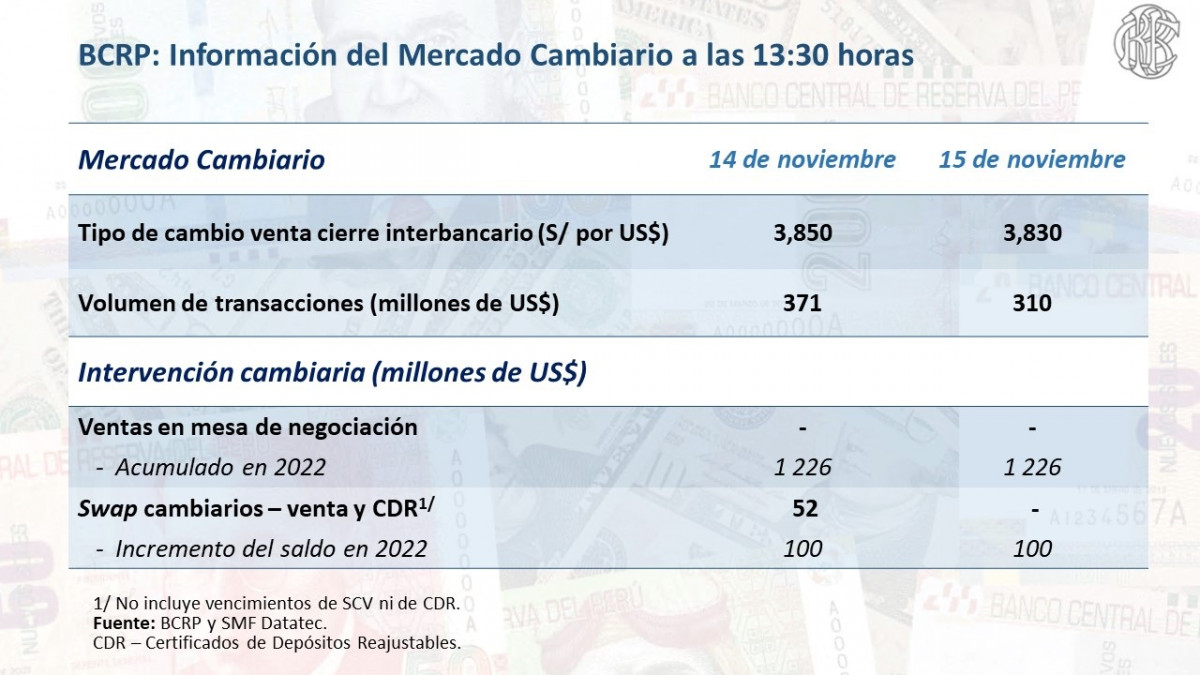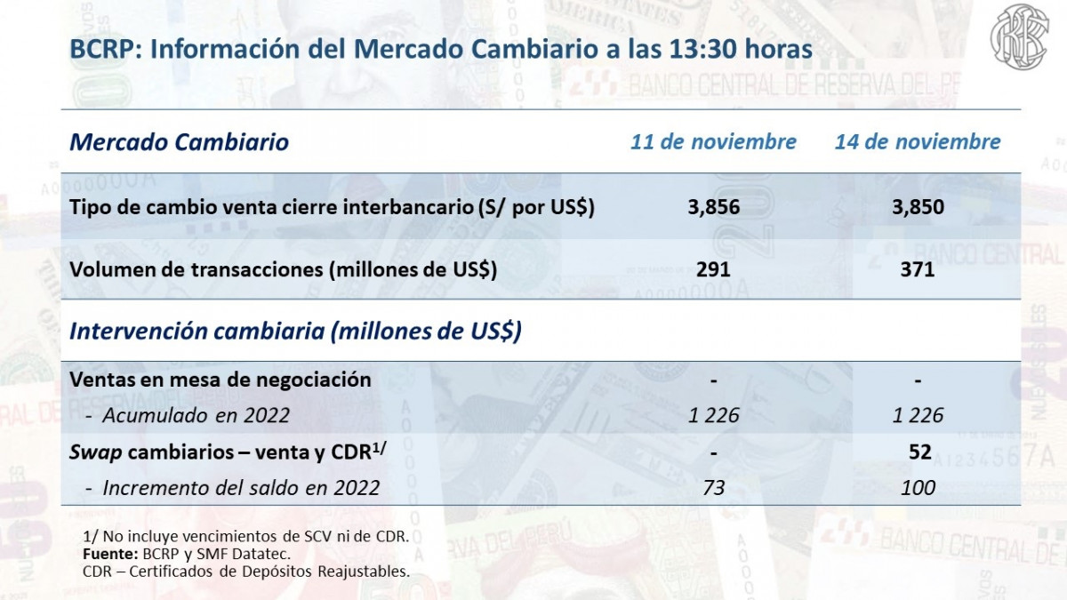 El tipo de cambio cerró la jornada el día lunes 14 de noviembre cotizando en S/ 3.850, según informó el BCRP a través de su cuenta oficial de Twitter.