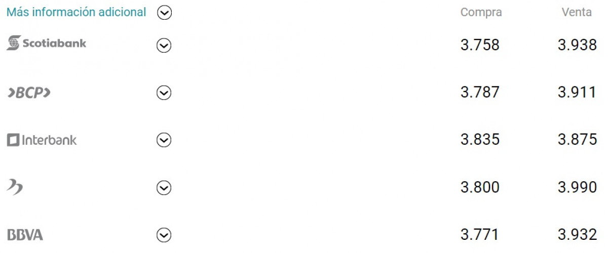 De acuerdo al portal cuantoestaeldolar.pe, el tipo de cambio en los bancos se cotiza en: