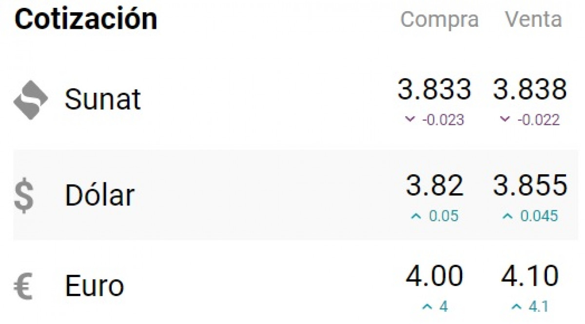 De acuerdo al portal cuantoestaeldolar.pe, el tipo de cambio se cotiza en: