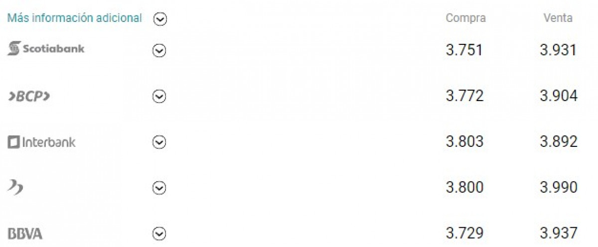 De acuerdo al portal cuantoestaeldolar.pe, el tipo de cambio en los bancos se cotiza en: