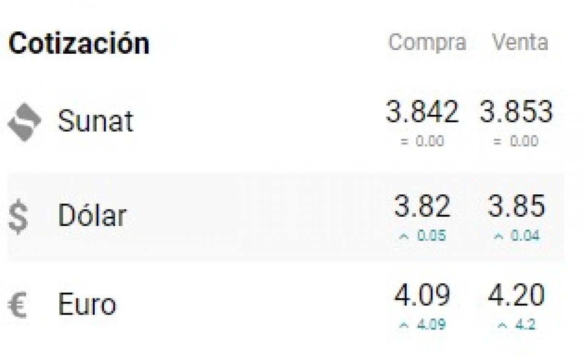 De acuerdo al portal cuantoestaeldolar.pe, el tipo de cambio se cotiza en: