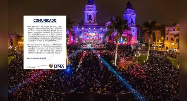 "Por disposición del alcalde de Lima, Renzo Reggiardo, y en señal de duelo por el fallecimiento de Jessica Corachahua Toledo y Wilfredo Rosales Mallma, trabajadores de EMAPE que perdieron la vida cumpliendo su labor en el trágico accidente ocurrido en la Panamericana Sur, se ha dispuesto la suspensión de la Serenata a Lima, programada para el sábado 17 de enero en la Plaza de Armas.