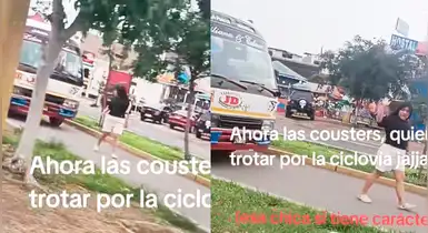 En las imágenes se observa a la mujer caminando por la ciclovía mientras una couster permanece detrás de ella tras haber invadido el carril destinado a ciclistas. El vehículo buscaba seguir avanzando pese a encontrarse dentro de un espacio que no corresponde al transporte público.