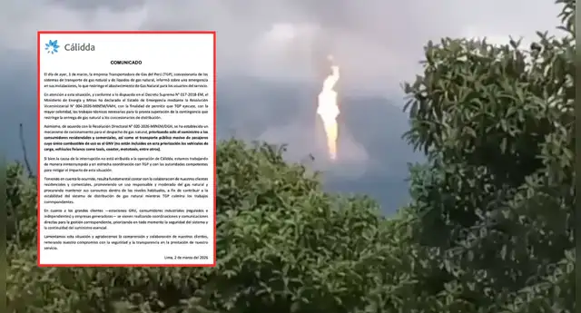 Lo último. Cálidda ha emitido un comunicado vía redes sociales, donde reveló que la Transportadora de Gas del Perú (TGP) tuvo una emergencia dentro de sus instalaciones el pasado domingo 1 de marzo del 2026 en Cusco, La Convención. ¿Qué pasará con las reservas de gas natural y cómo afectará a los ciudadanos? En la siguiente nota te contamos los detalles.