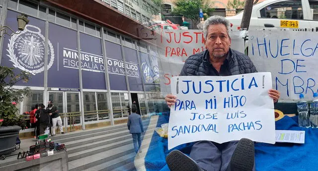 Don José Sandoval Elías es un adulto mayor de 61 años quien viene realizando una huelga de hambre en los exteriores del Ministerio Público con la finalidad de exigir justicia tras la liberación del presunto asesino de su hijo. Con botella en mano y tres carteles hace un pedido a las autoridades.