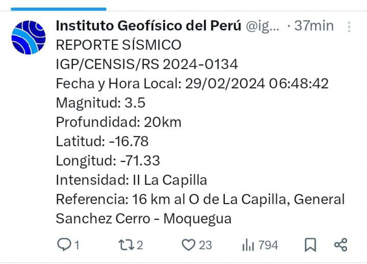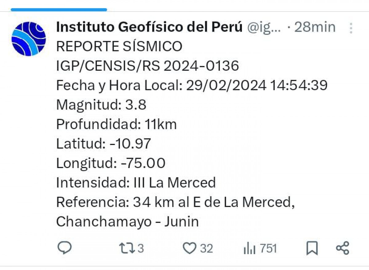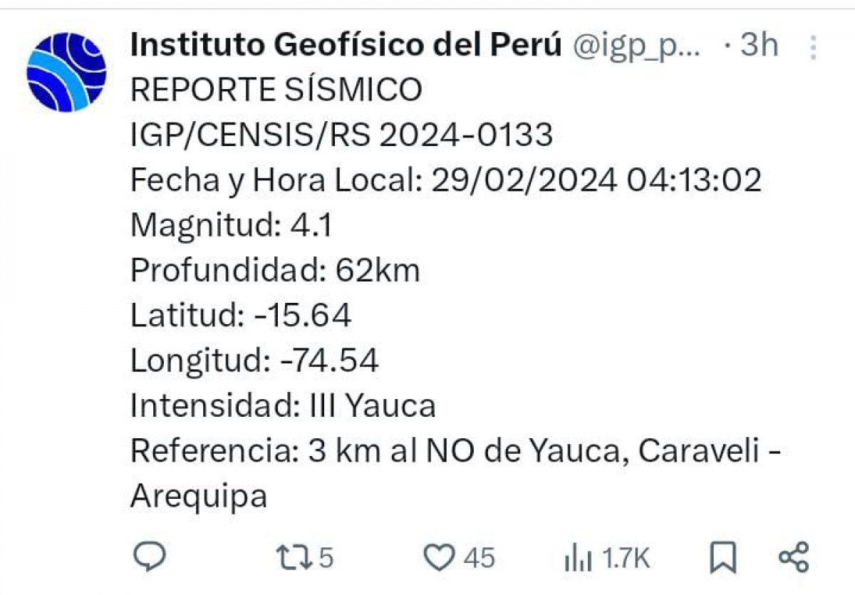 Ocurrió un temblor en Perú, HOY, 29 de febrero del 2024, según los datos recogidos por el Instituto Geofísico del Perú (IGP) a través de su cuenta oficial de Twitter (ahora X), te contamos los movimientos sísmicos que registra nuestro país.