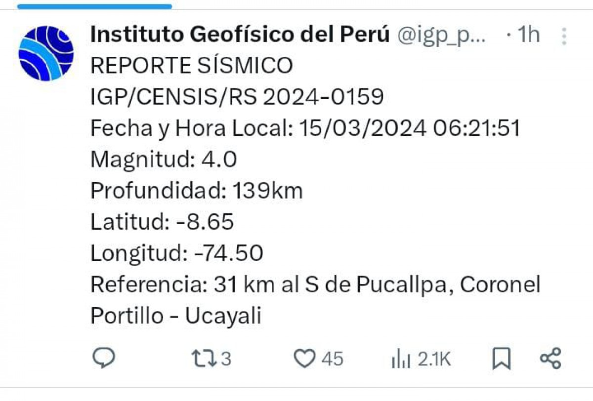 Ocurrió un temblor en Perú, HOY, 15 de marzo del 2024, según los datos recogidos por el Instituto Geofísico del Perú (IGP) a través de su cuenta oficial de Twitter (ahora X), te contamos los movimientos sísmicos que registra nuestro país.