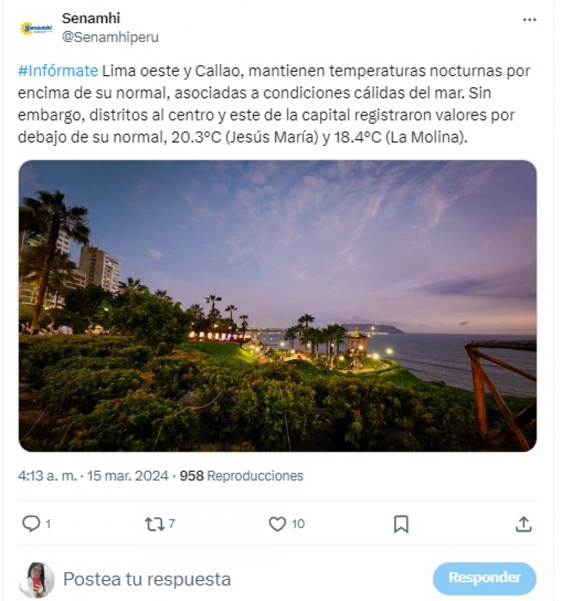 #Infórmate Lima oeste y Callao, mantienen temperaturas nocturnas por encima de su normal, asociadas a condiciones cálidas del mar. Sin embargo, distritos al centro y este de la capital registraron valores por debajo de su normal, 20.3°C (Jesús María) y 18.4°C (La Molina).