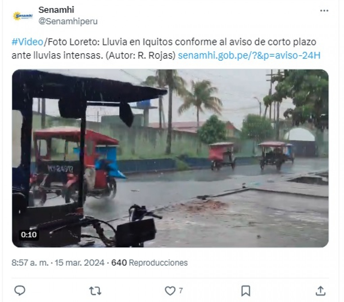 Senamhi advierte de presencia de lluvias en Iquitos.