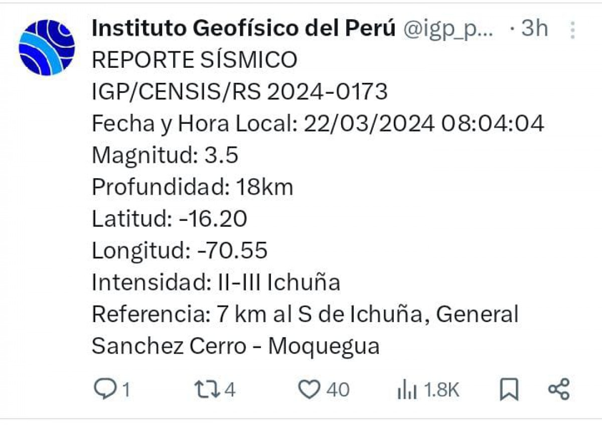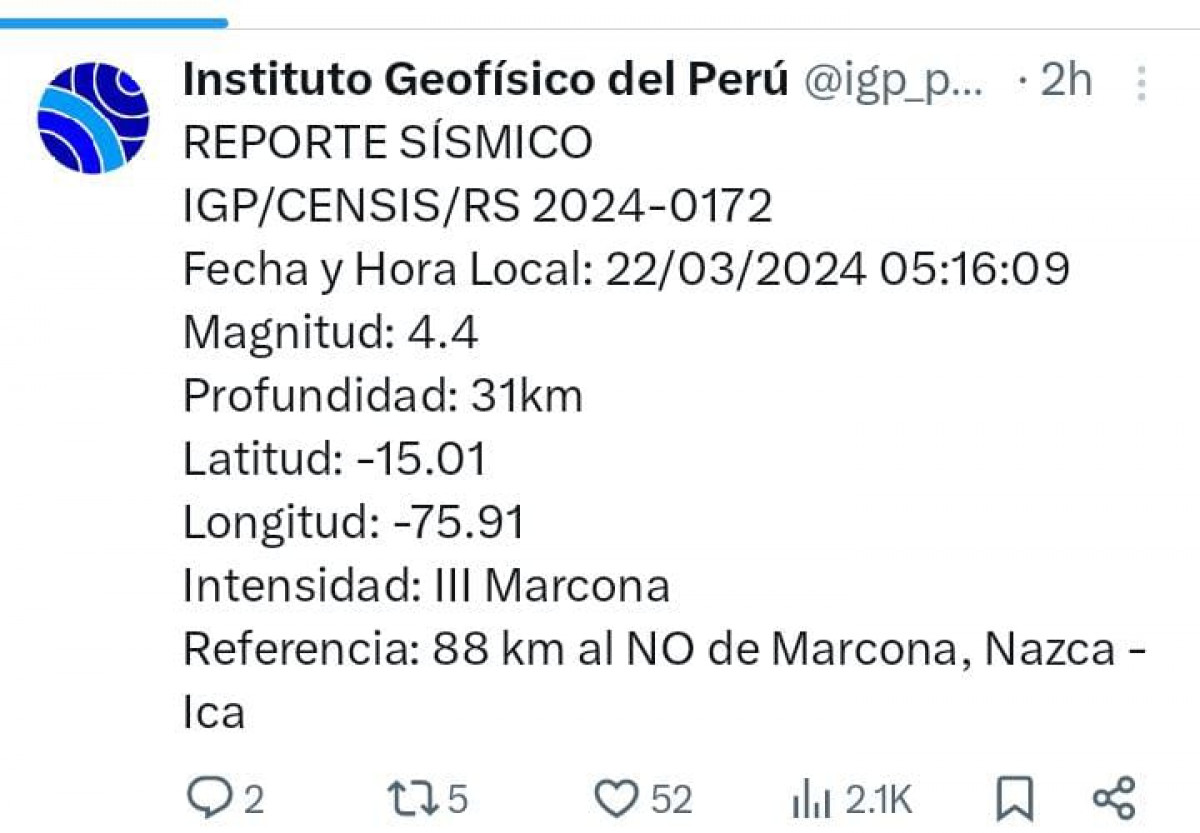 Hoy, viernes 22 de marzo del 2024, se produjo un sismo en Perú, según la información recopilada por el Instituto Geofísico del Perú (IGP) a través de su cuenta oficial de Twitter, ahora conocida como X. Aquí presentamos un informe detallado de los movimientos sísmicos registrados en nuestro país.